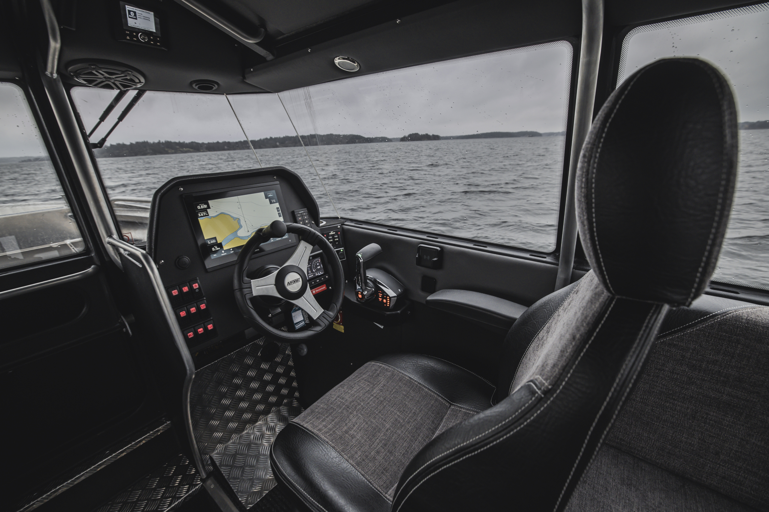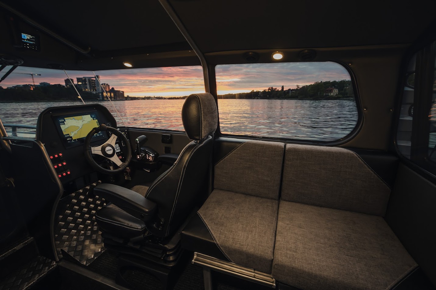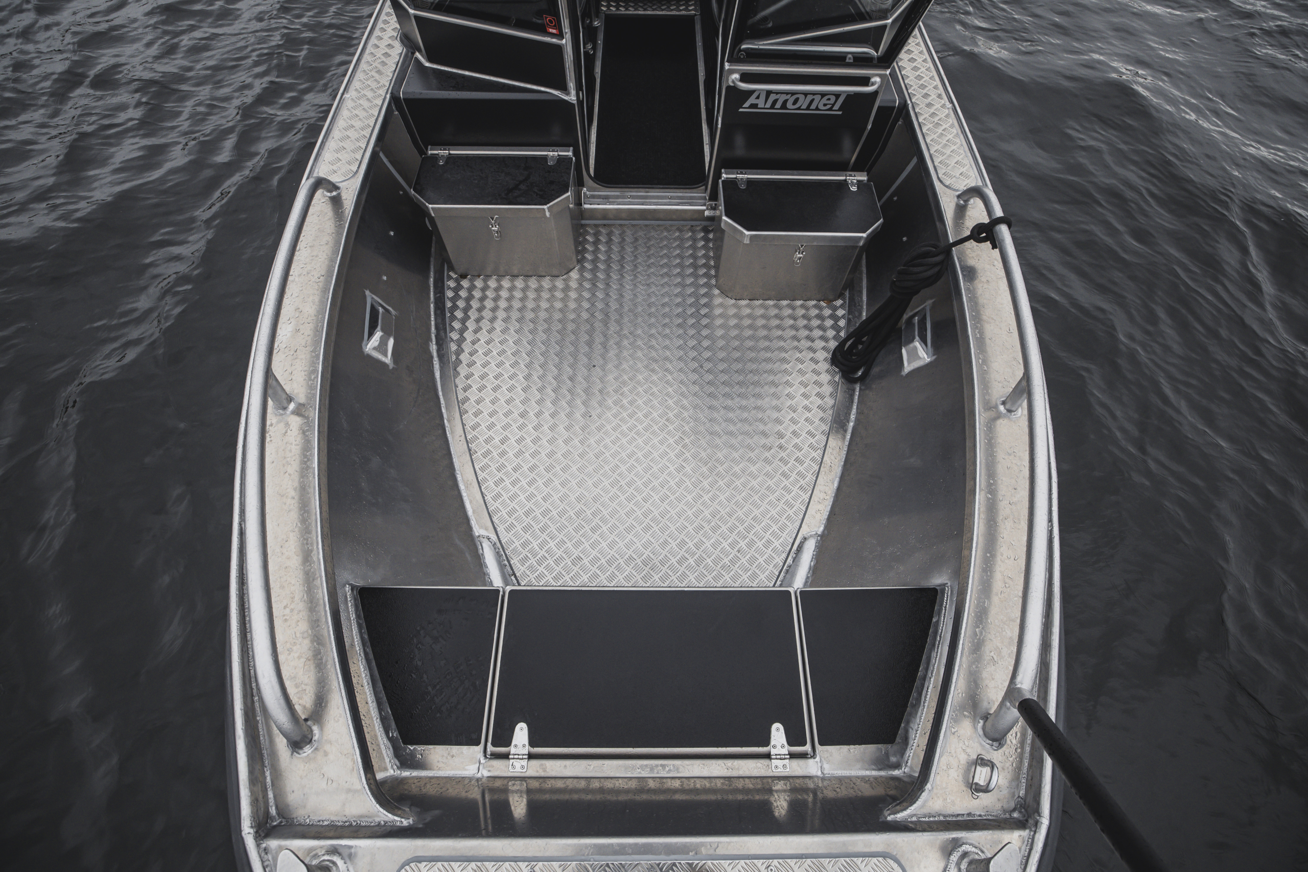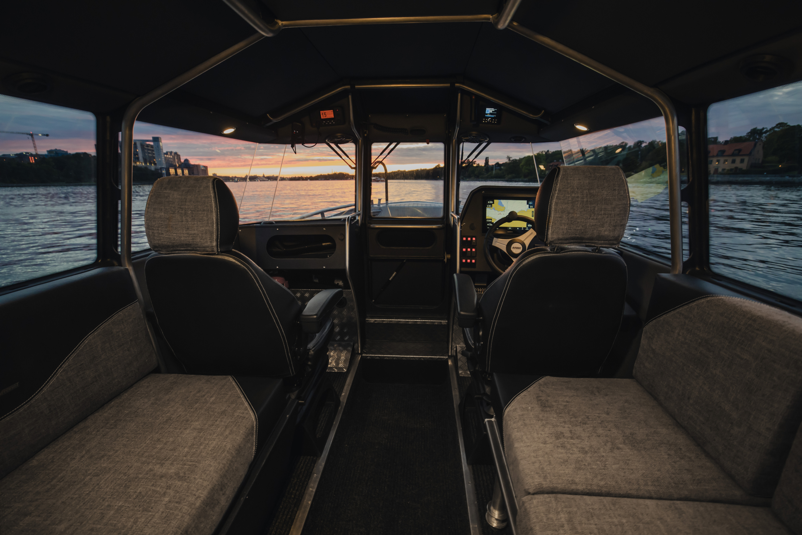 Under akterdäcket finns det gott om förvaringsutrymme för packning, matkassar och mycket mer. Hytten är utformad med mjuka material som effektivt dämpar buller, vilket skapar en tyst och behaglig miljö. Skjutdörren till fördäcket är även den smart utformad, en del av taket öppnas för att underlätta passage.