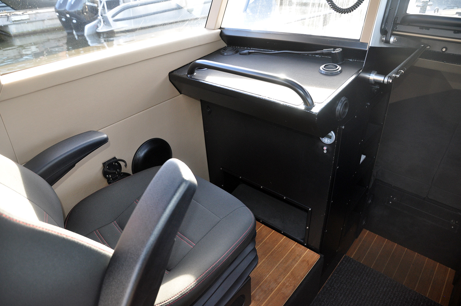 2 st Sittbänkar, en med porta-potti under sofflock BB sida hytt bakom förare.
