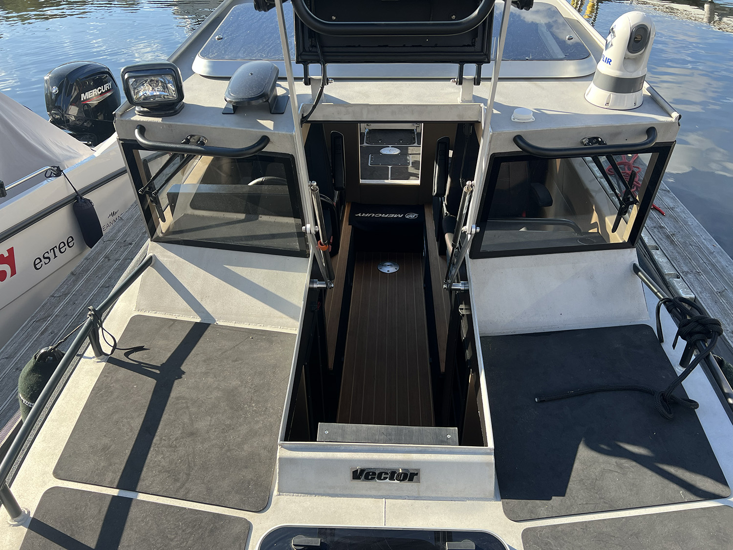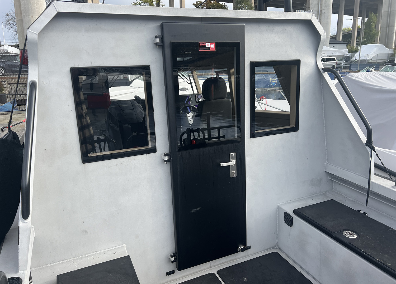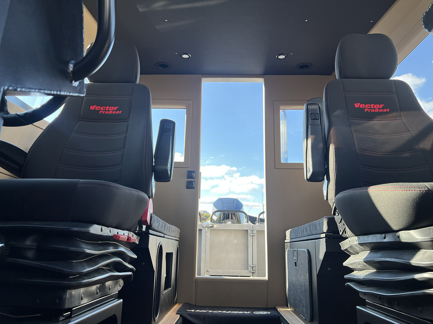 Mjuk dörr som avskärmar hytt från förkabin, rullas undan när den inte används